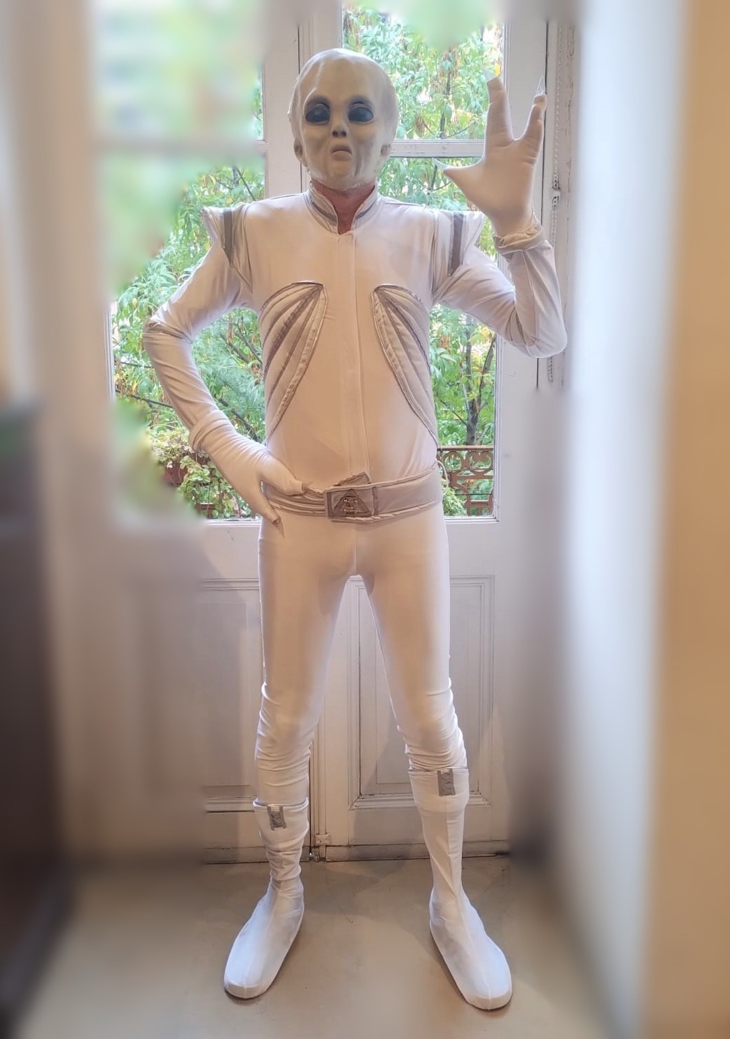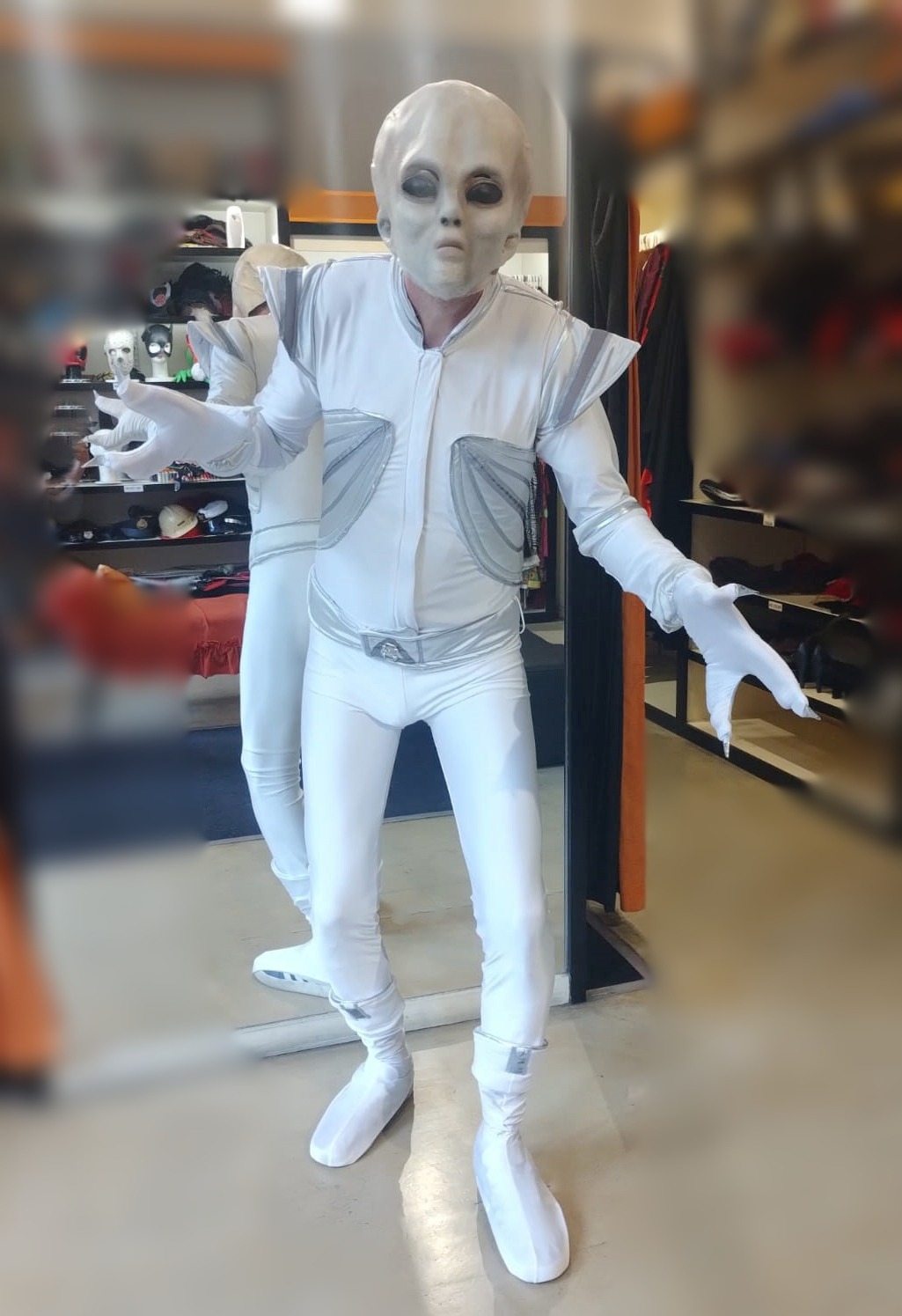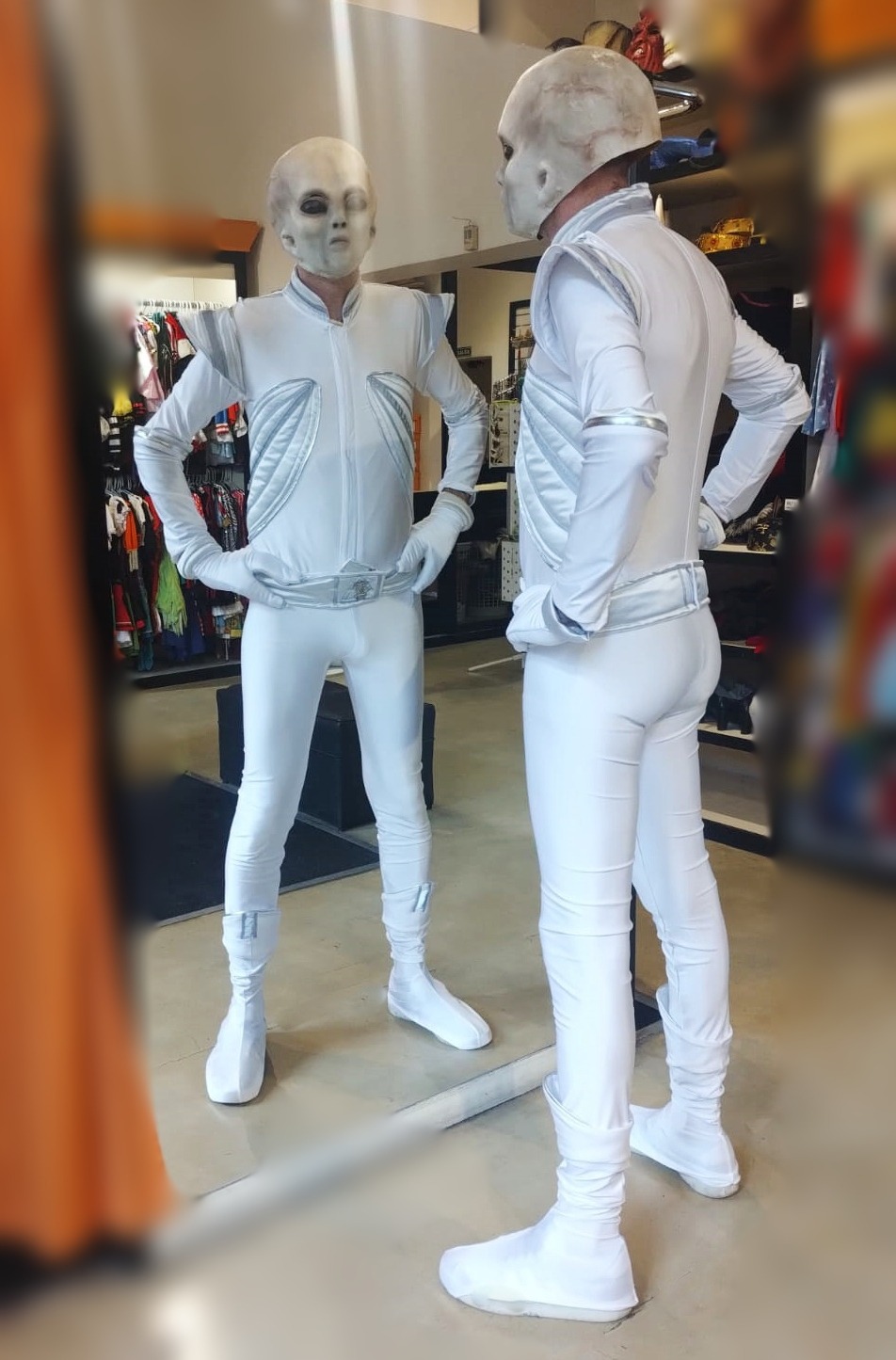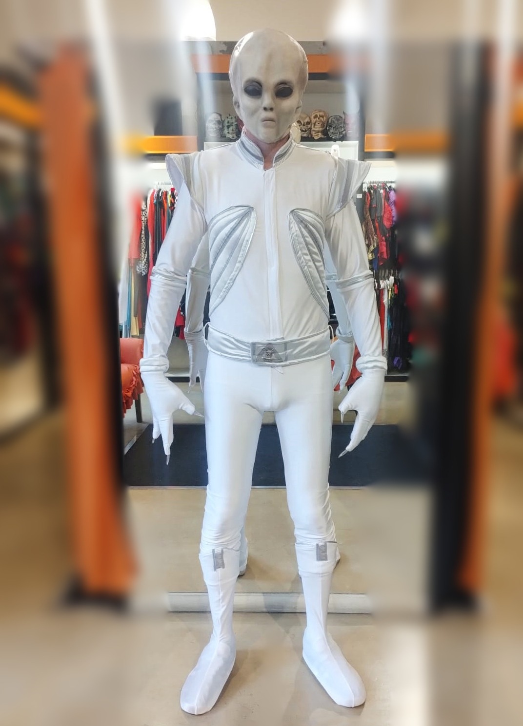 Disfraz compuesto por: Enterito, cinturón, cubre calzado, guantes y máscara.