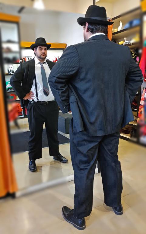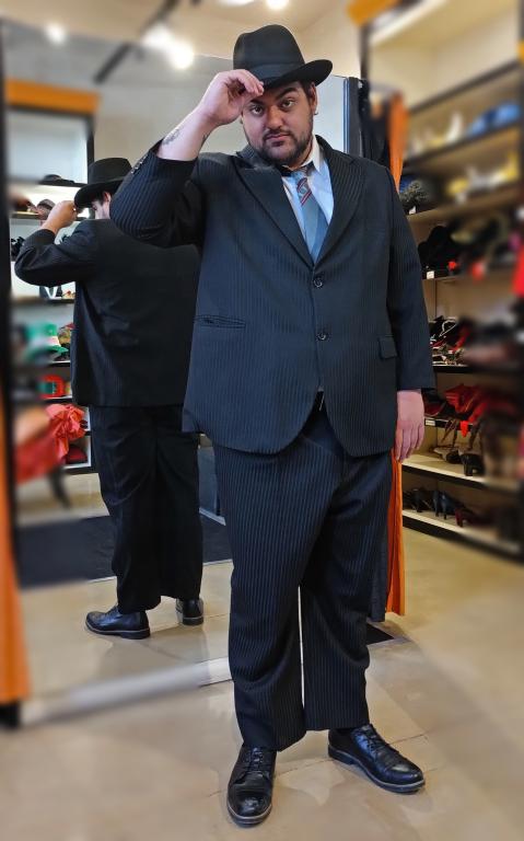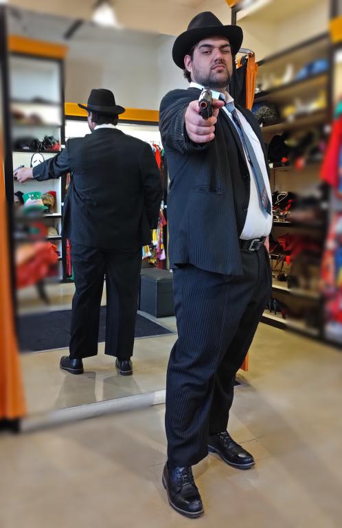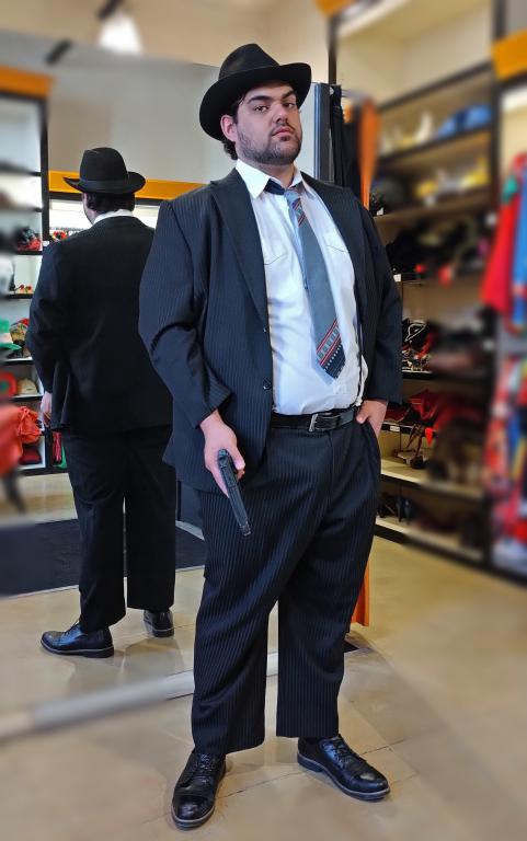 Disfraz compuesto por: Camisa, saco, pantalón, tiradores, arma y sombrero.