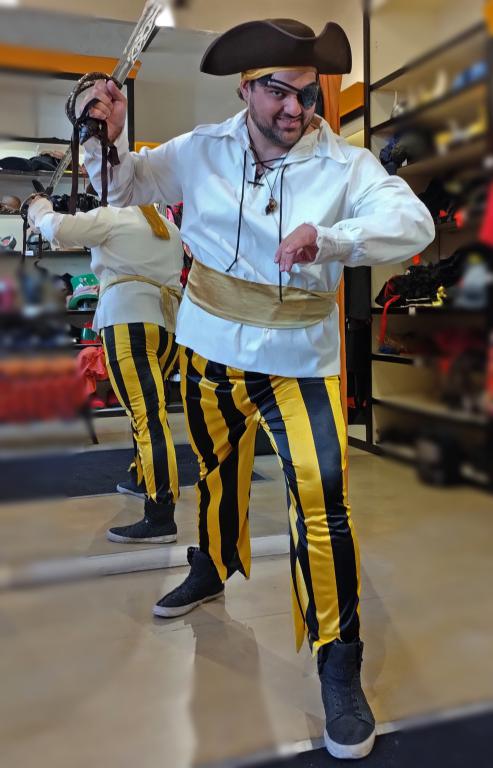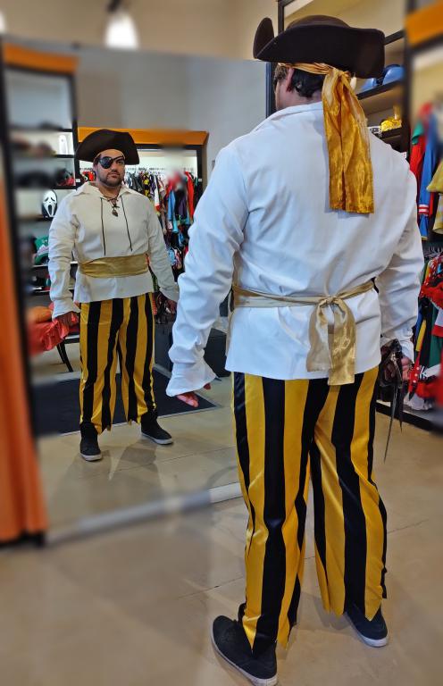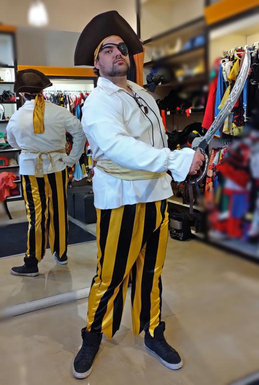 Disfraz compuesto por: Remera, pantalón, faja, collar, parche, espada y sombrero.